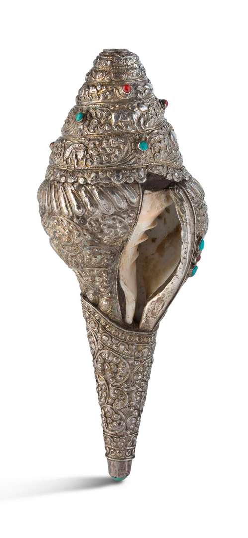 Conque rituelle shanka formé d'un coquillage intégralement recouvert d'une monture en argent repoussé et de cabochons de pierres dures. En partie inférieure du coquillage, des motifs de fleurs et rinceaux. La partie centrale ornée d'une tête de kirthimukha encadrée de deux dragons sur un fond de rinceaux denses, surmontant une frise de pétales de lotus. En partie supérieure, une frise spiralée d'animaux alternant avec des rinceaux.