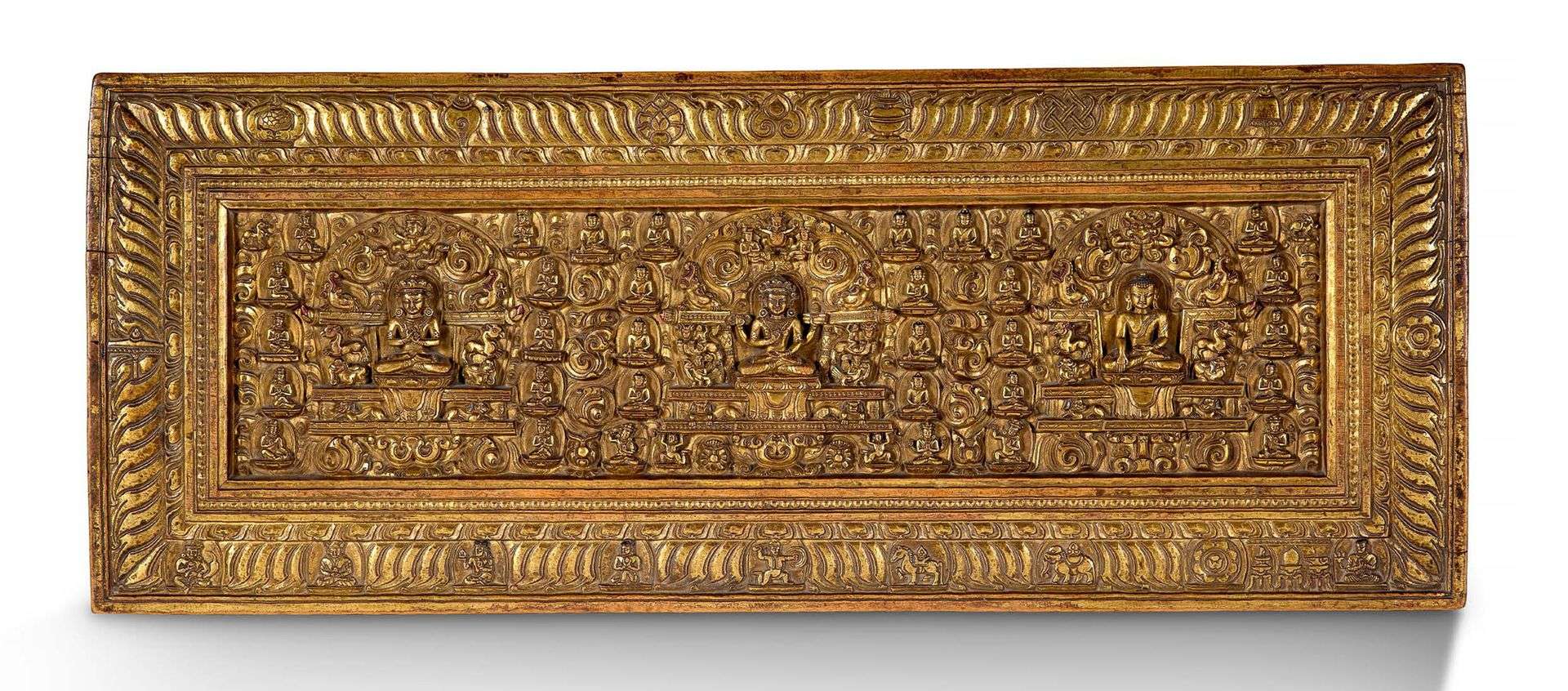 = Importante couverture de manuscrit bouddhique en bois sculpté doré représentant en son centre, Prajnaparamita assise en vajrasana sur une trône élaboré, les mains en vitarka et dhyana mudra, tenant un vajra et un pustaka, sous un torana avec des créatures mythiques, makara, naga, et surmonté d'un Garuda. De part et d'autre, les représentations des bouddhas Shakyamuni et Vairochana dans des niches similaires.