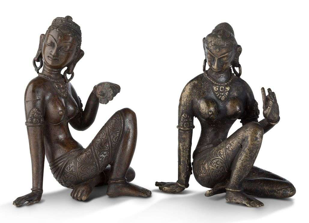 Deux statues d'adorantes en bronze à patine brune représentées assises, vêtues de fin dothi ciselés de rinceaux floraux, parées de bijoux.