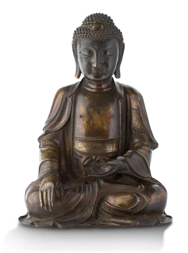 = Importante statue du Bouddha Shakymuni en bronze partiellement doré, représenté assis en padmasana, la plante des pieds incisée de dharmachakra, vêtu d'une robe monastique couvrant ses deux épaules, retombant en plis élégants et rehaussée de frises de rinceaux ciselés. Les mains aux doigts délicats en bhumisparsha mudra. Le visage rond et plein, la bouche petite, les yeux mi-clos, le front marqué de l'urna et l'expression bienveillante. Les boucles de la chevelure détaillées en une multitude de petits picots.