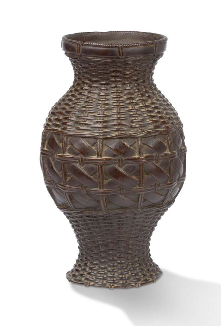 Vase balustre en bronze à patine brune à l'imitation d'un panier vanné. La base perçée.