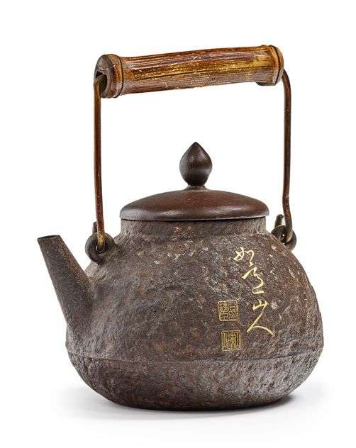 Théière couverte en fonte de fer à décor d'incrustations d'or représentant sur une face une calligraphie et un cartouche rectangulaire à caractères sigillaires, l'autre face avec une calligraphie et deux cachets carrés à caractères sigillaires. Une signature en léger relief dans la fonte à l'arrière de la théière.