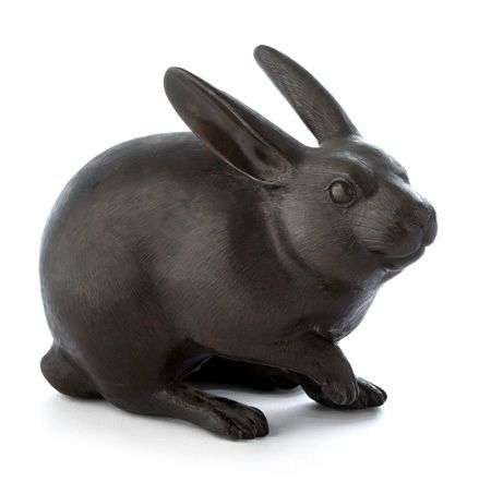 Okimono en bronze à patine brune représentant un lapin assis, une patte relevée, la fourrure finement détaillée, l'oeil vif, la sculpture dans un style naturaliste. La base avec un cartouche.