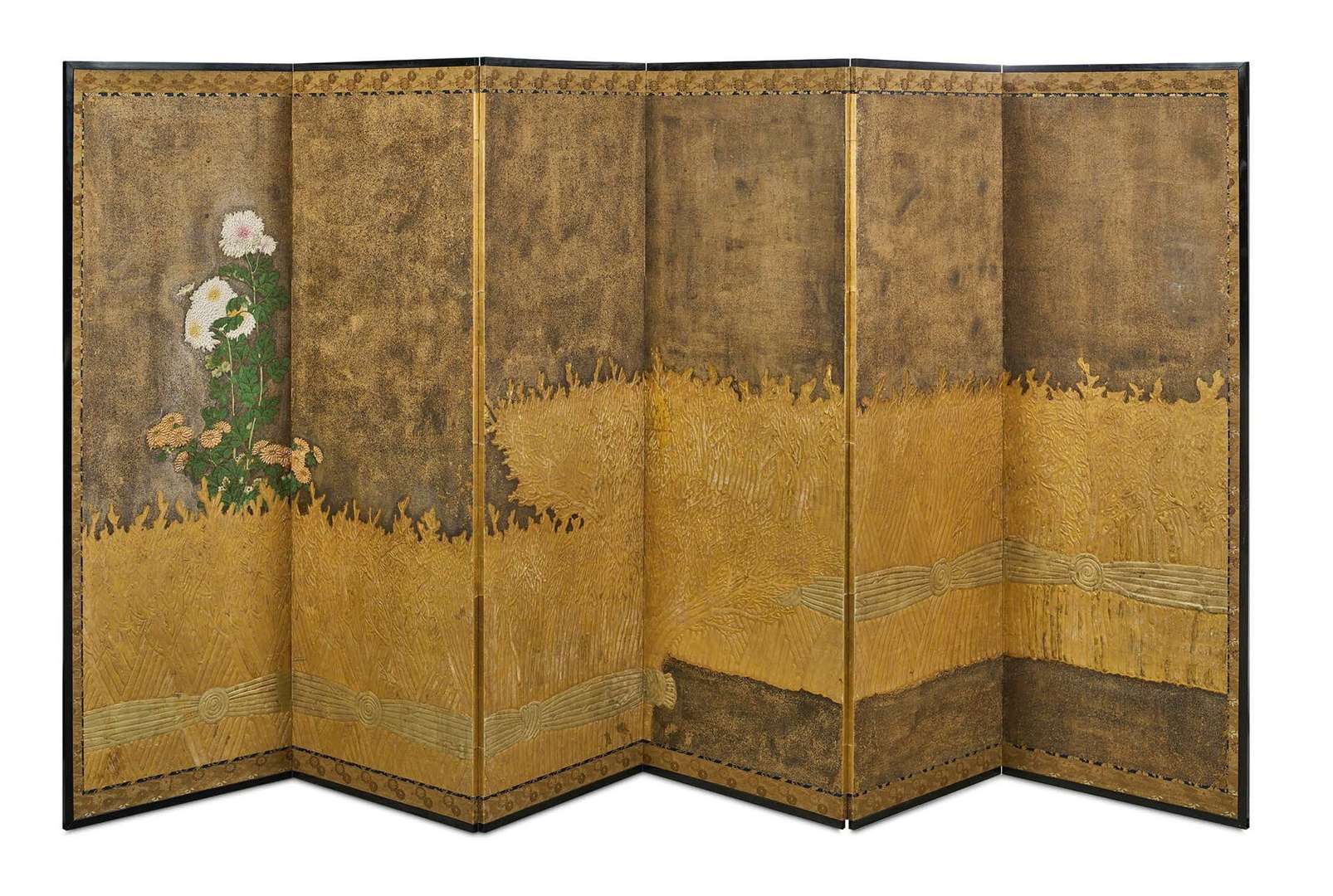 = Paravent à six feuilles décoré à l'encre, couleurs, feuilles d'or et applications de gofun sur fond brun moucheté d'argent, représentant une haie de gerbes de blé d'où émergent des chrysanthèmes blanches.