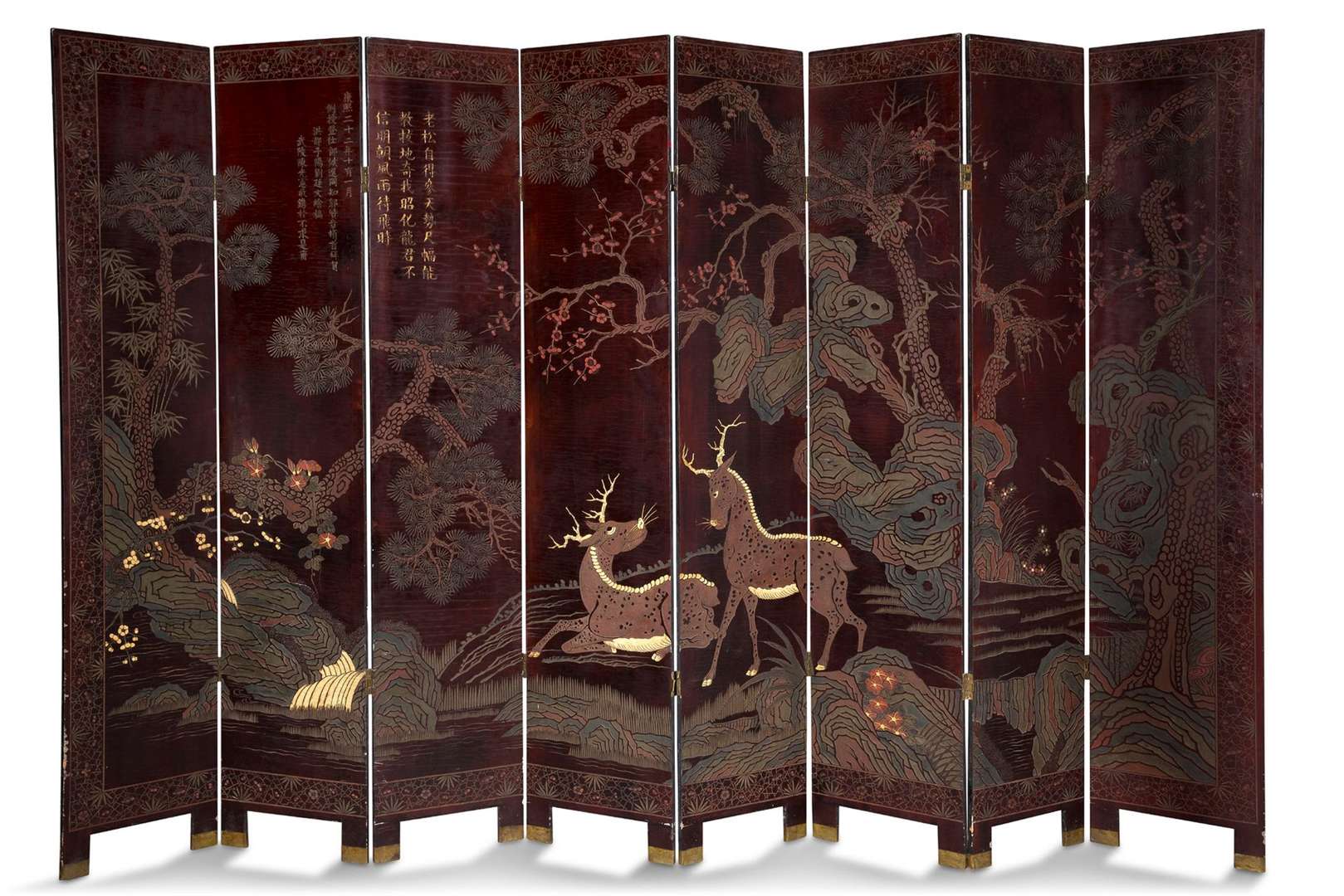 Paravent à huit panneaux en laque de coromandel sur fond brun, à décor polychrome et doré, sur le registre principal, d'une scène de palais animée de personnages, sur le registre supérieur, de dragons passants et, en partie basse, d'objets anciens et de vases emplis de fleurs, l'autre face représentant un couple de daims dans un paysage planté de prunus, pins et bambous avec une calligraphie. dim. (un panneau) 213 x 39,5 cm dim. (totale) 213 x 320 cm (accidents et restaurations anciennes, les charnières rapportées)