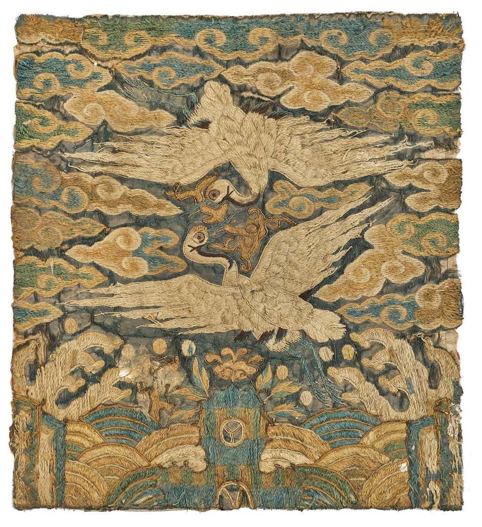 Rare badge de rang en soie brodé aux fils polychromes et d'or représentant deux grues tenant un champignon d'immortalité, survolant un rocher parmi les flots écumants, le ciel densément peuplé de nuages stylisés.