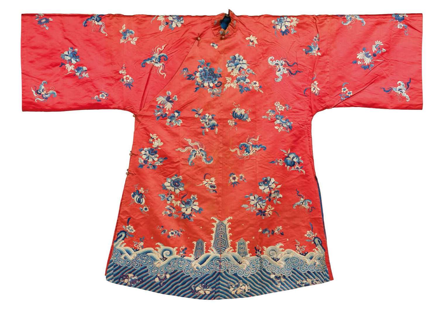 Robe de cour informelle (changyi) en soie rouge brodée en camaïeu de bleu d'un semis de bouquets de pivoines, grenades, courges, citron digités et peuplée de papillons voletants. En partie inférieure, une bande de lishui surmontée de flots tumulteux d'où émergent les pics sacrés et des objets auspicieux. Boutons en pierre dure orangée.