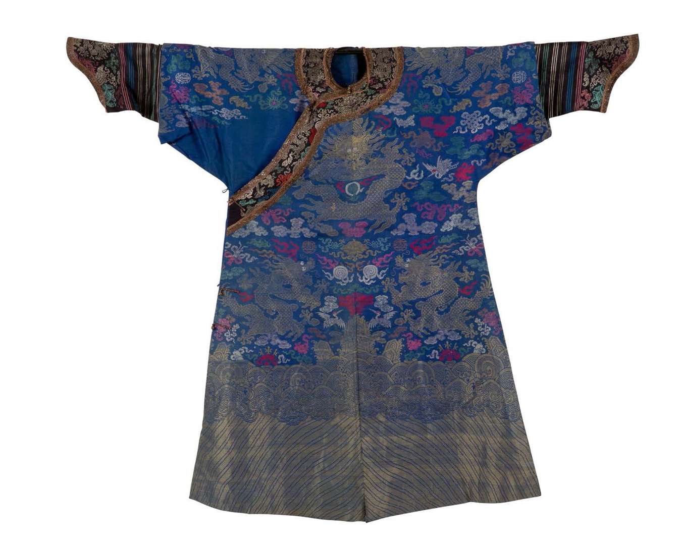 Belle robe pour la saison chaude en soie bleue, à décor polychrome broché de dragons dans les airs sur fond de caractères auspicieux et d'emblèmes bouddhiques au-dessus d'une large bande de lishuis d'où s'élèvent des rochers primordiaux et des emblèmes bouddhiques. H. 134,5 cm - Larg. 163 cm (Petits accidents, taches, usures et possiblement transformée)