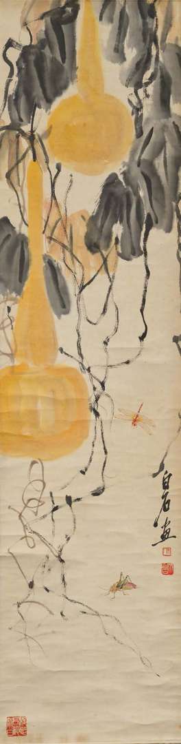 Baishi, représentant des calebasses avec une libellule et un criquet. Signature et deux cachets apocryphes à droite, un cachet en partie inférieure gauche.