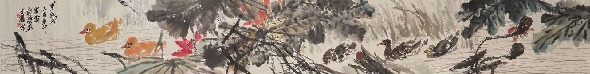 Peinture horizontale montée en rouleau à l'encre et couleurs sur papier dans le style de Qi Baishi, représentant des canards parmi les lotus. Signature et cachets apocryphes en fin de rouleau.