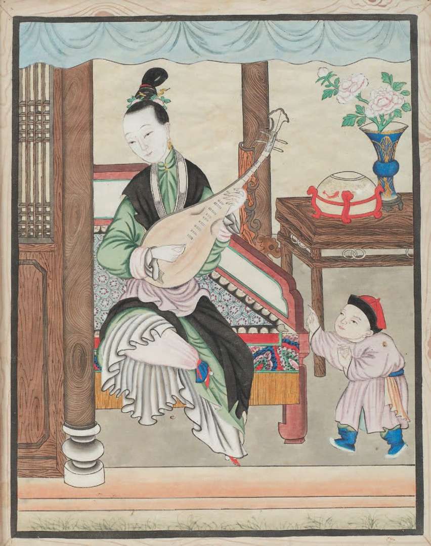 Gouache sur papier avec des rehauts d'or représentant un femme et un enfant dans un intérieur, la jeune dame élégamment vêtue, assise sur une banquette, jouant de la pipa tandis qu'un jeune garçon se tient debout à ses côtés, une table en arrière plan avec un vase Gu fleuri de pivoines et un aquarium abritant des poissons. Dans un encadrement.
