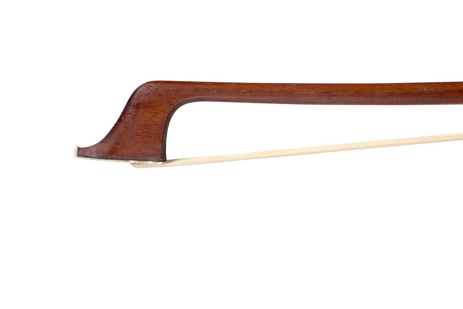 Baguette en bois de pernambouc montée de sa hausse et son bouton ébène et argent, modèle Vuillaume. Plaque de tête et garniture d'origine