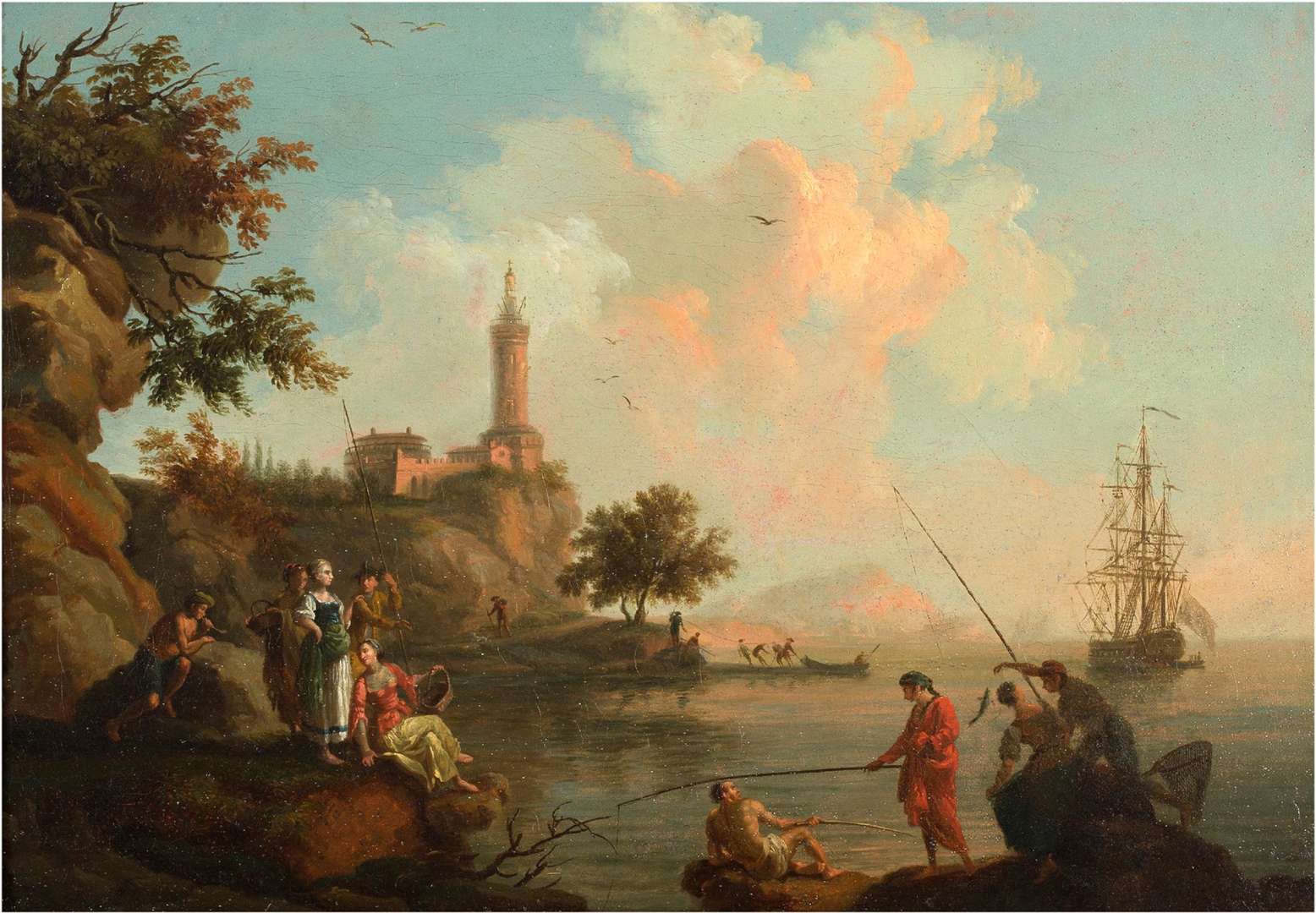 Cette vue côtière apparait comme un archétype de la production du peintre marseillais : comme dans nombre de ses tableaux, se retrouvent des personnages au premier plan, s'adonnant à des activités diverses, simples et que l'on imagine rythmer leur quotidien. À l'arrière-plan, des marins tirent leur barque qu'ils arriment au ponton, un promeneur longe la côte, accompagné de son chien tandis qu'au premier plan, des pécheurs attendent que le poisson ne vienne mordre, butin à venir que viennent surveiller un groupe de femmes, tenant des paniers prêts à le recevoir.