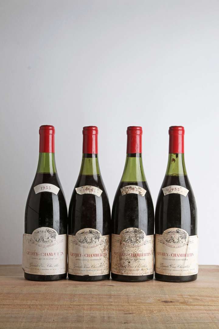 4 B GEVREY-CHAMBERTIN (3 à 4| 1 à 5 cm| e.t.h. dont 1 e.a| clm.s| 3 capsules incurvées| 2 bouchons engagés) - 1955 - Chevillot