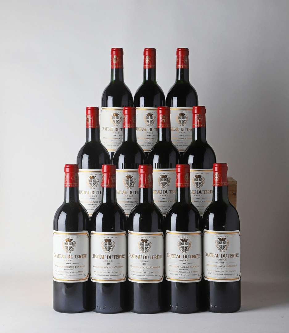 12 B CHATEAU DU TERTRE (Caisse Bois d'origine) (5 T.L.B.+| 6 T.L.B. et 2 H.E.+| quelques capsules avec accrocs bas de jupes par guillotines) - 1985 - GCC5 Margaux