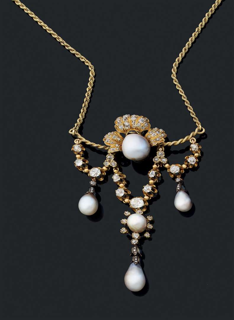 A natural pearl, enamel, diamond and gold and silver necklace, report