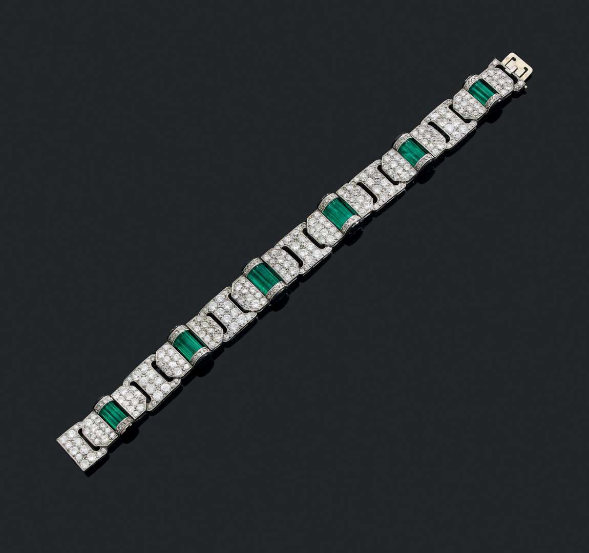 An emerald, diamond, enamel, gold and platinum bracelet, stamped, certificate