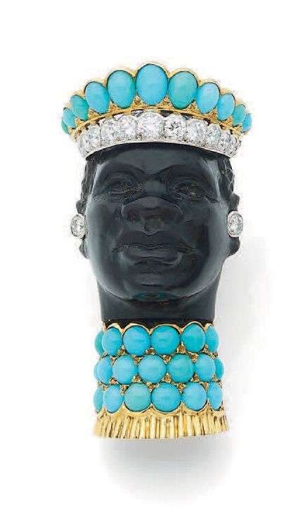 Cabochon de turquoises, diamants, ambre noire sculptée (?)
