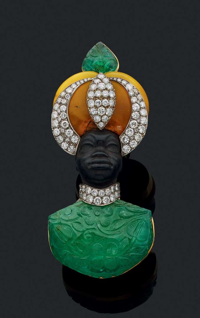 Émeraude gravée, ébène sculpté, ambre et diamants taille brillant