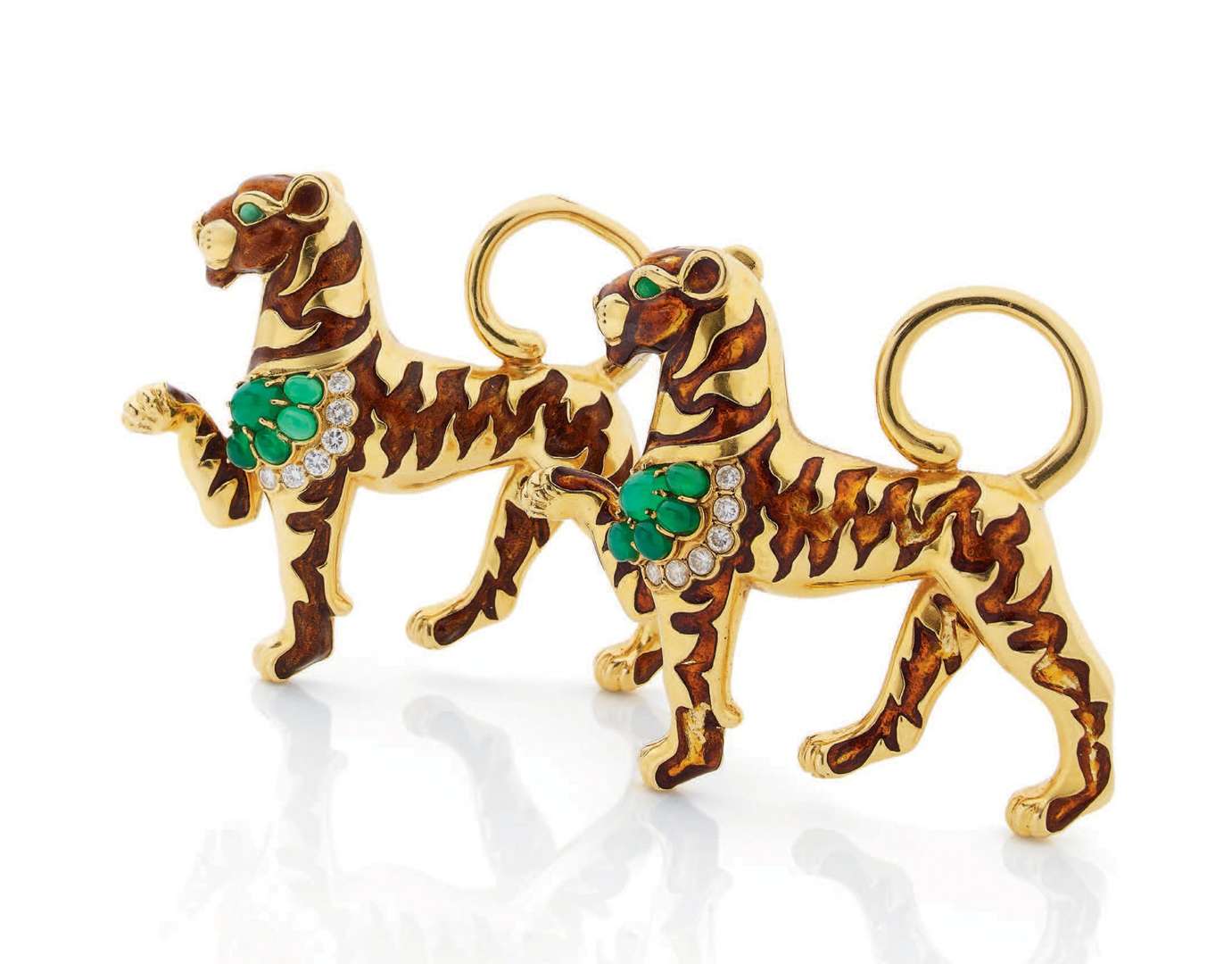 Tigres émaillés, émeraudes cabochons et diamants taille ancienne