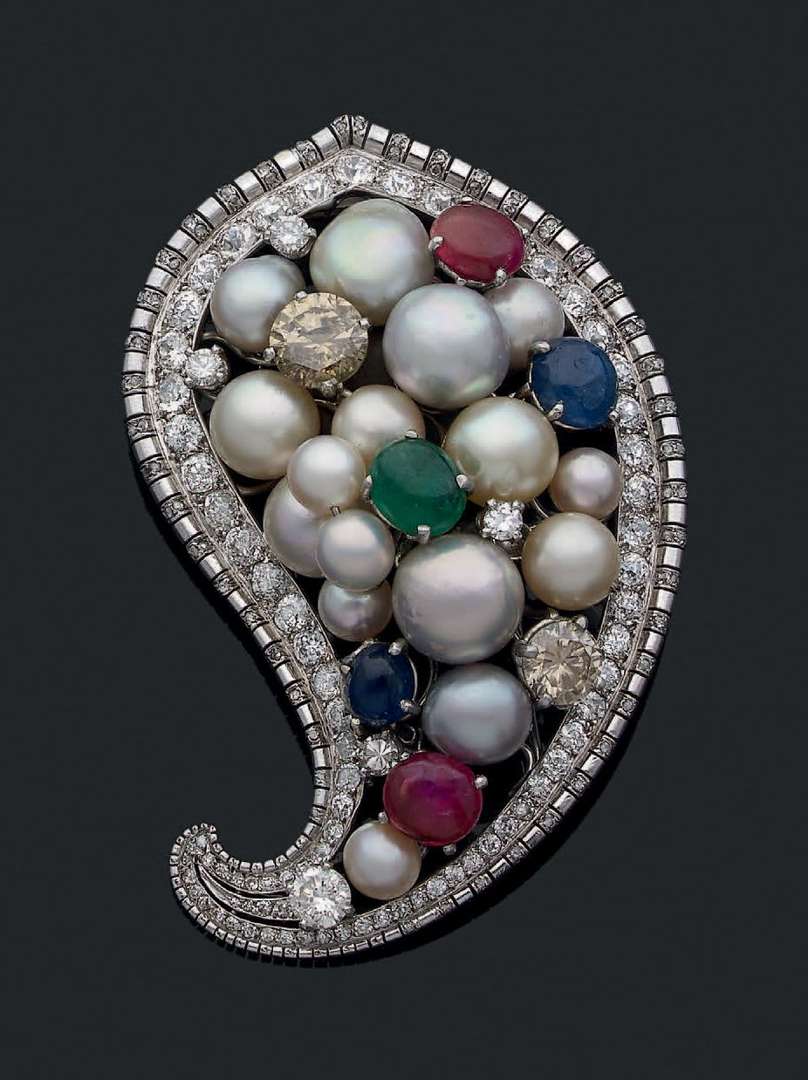 A pearl, ruby, sapphire, emerald, diamond, platinum and steel clip