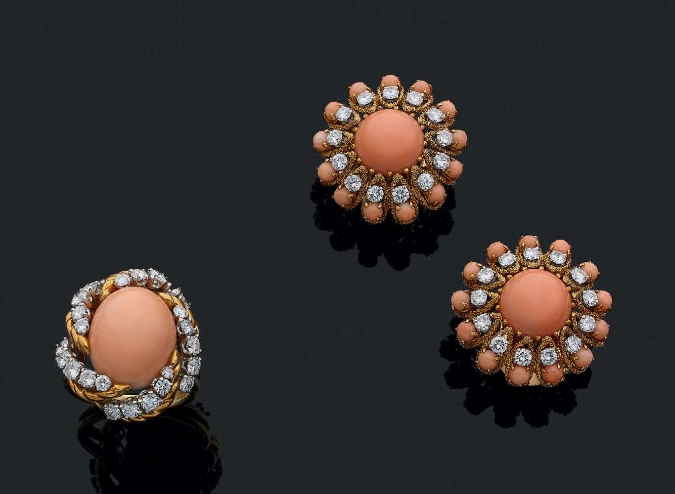 Coral,diamond and gold earrings and ring, signed Van Cleef & Arpels