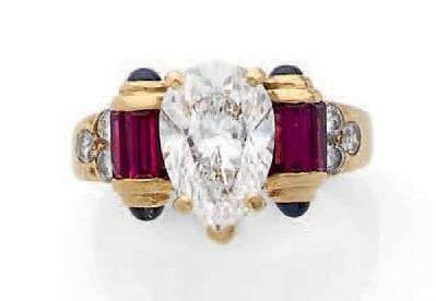 Diamant poire et diamants taille brillant, rubis calibrés et saphirs cabochons