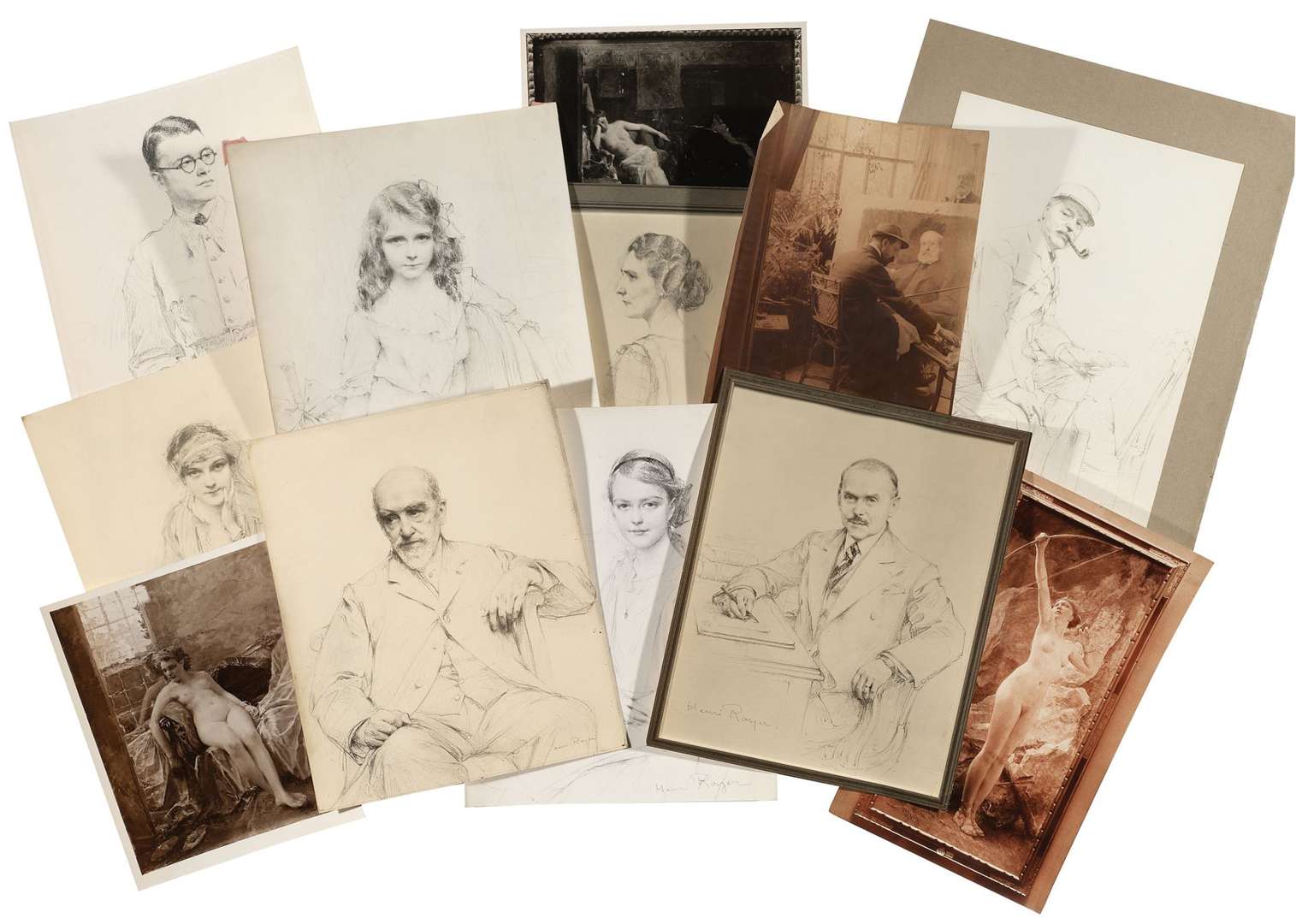 Fort lot de photographies anciennes et de reproduction d'œuvres d'Henri Royer (portraits, scènes de genre, tableaux d'histoire etc.) et une photographie de l'artiste au travail