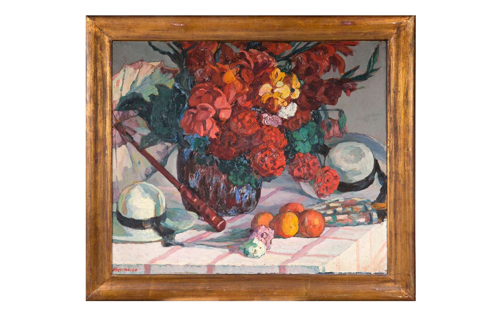 Nature morte aux bouquet de fleurs, ombrelles et chapeaux