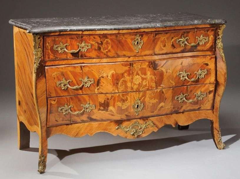 Commode galbée en bois de placage marqueté de fleurs et de feuillages dans des encadrements feuillagés. Elle ouvre par trois tiroirs, dont deux sans traverse. Montants et pieds cambrés. Ornements de bronze ciselé et doré. Epoque Louis XV H: 88 - L: 130 - P: 51 cm Plateau de marbre gris saint Anne restauré