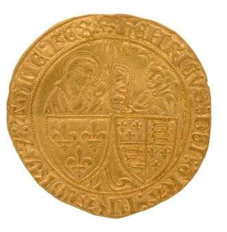 Salut d'or figurant à l'avers la salutation angélique avec l'archange Gabriel (à droite) debout vers la gauche, les ailes à moitié déployées, faisant face à la Vierge Marie (à gauche) debout vers la droite, qu'il visite et salue en lui tendant un parchemin portant l'inscription « AVE » | les personnages sont vus à mi-corps et placés derrière les écus accostés de France et France-Angleterre | au-dessus, cinq rayons de lumière divine.Au revers, une croix latine accostée d'un lys et d'un léopard (Rouen), sous le pied de laquelle est une H onciale, le tout dans un décalobe fleurdelisé.6 septembre 1423 (2e émission).