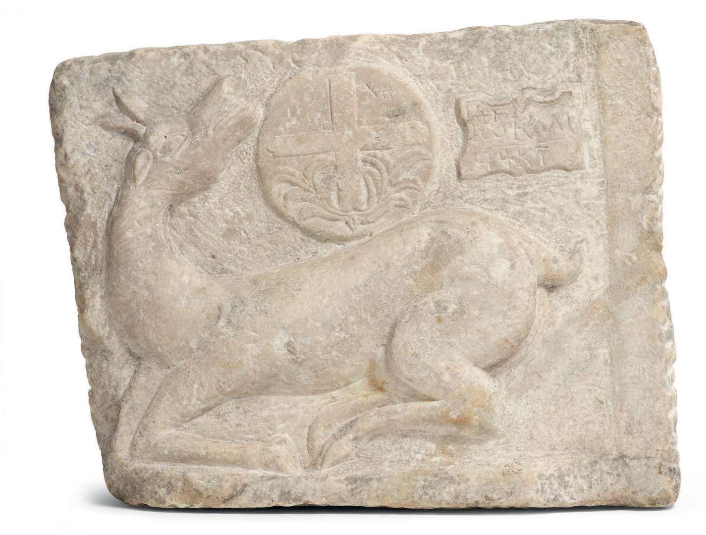 FRAGMENT DE SARCOPHAGE PALÉOCHRÉTIEN en marbre pentélique blanc sculpté, traité en bas relief et représentant un cerf couché surmonté d'un médaillon à la croix grecque issante de rameaux. À gauche un cartouche d'inscriptions gravées. Thessalonique, Ve siècle.