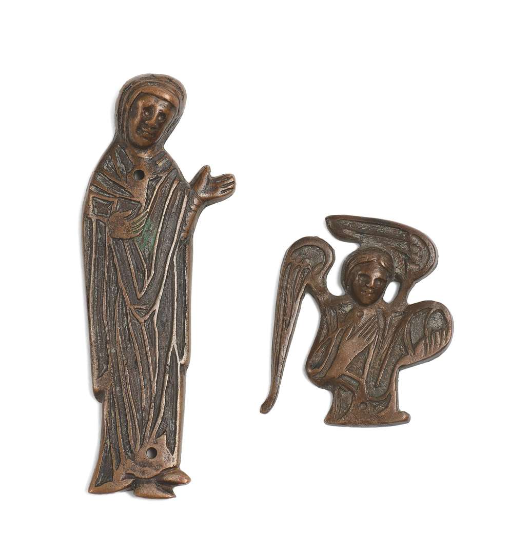 DEUX FIGURES D'APPLIQUES en cuivre champlevé représentant respectivement un ange et la Vierge Marie en Stabat Mater. Limoges, fin du XIIe siècle.