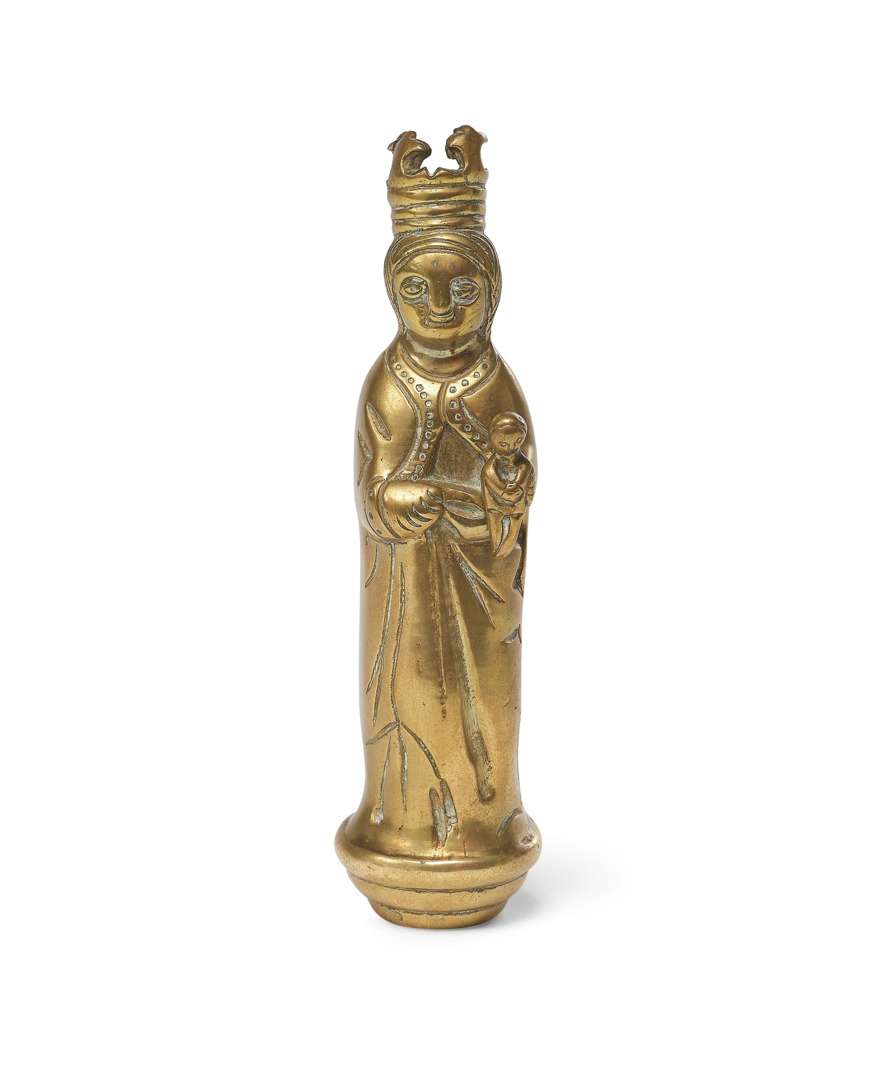 VIERGE DE PROCESSION en laiton, elle se tient debout, couronnée, l'Enfant Jésus dans sa main gauche. France, XIVe siècle.
