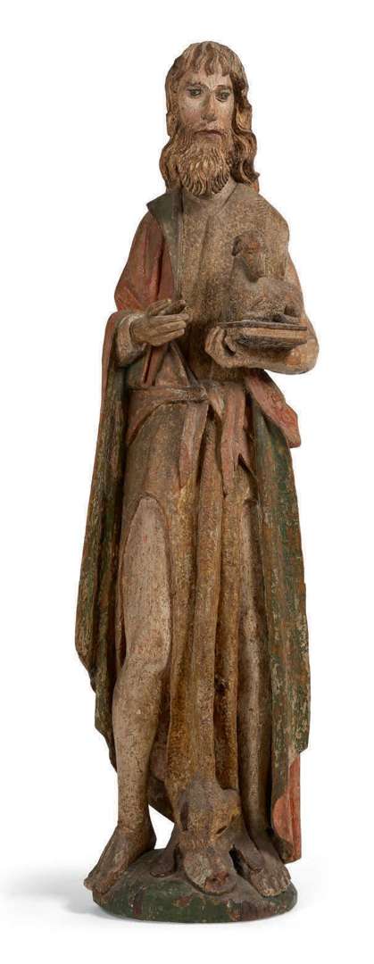 GRAND SAINT JEAN-BAPTISTE en bois de chêne sculpté et peint polychrome, il se tient debout, revêtu d'une peau de bête et tient l'Agneau Pascal sur un entablement. Dos ébauché. Allemagne du Nord, XVe siècle.
