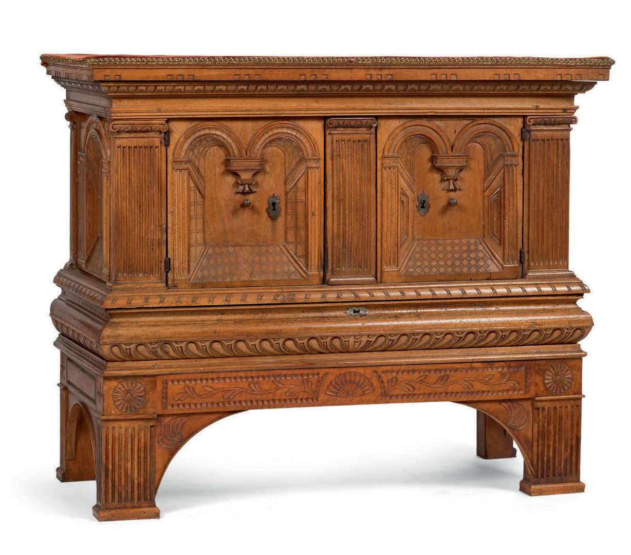BUFFET À VANTAUX en noyer au naturel, il ouvre par deux tabernacles, les panneaux de face et latéraux à décor sculpté en bas-reliefs de perspectives architecturales. En partie Lyon, XVIe siècle. Sur un piètement postérieur adapté.
