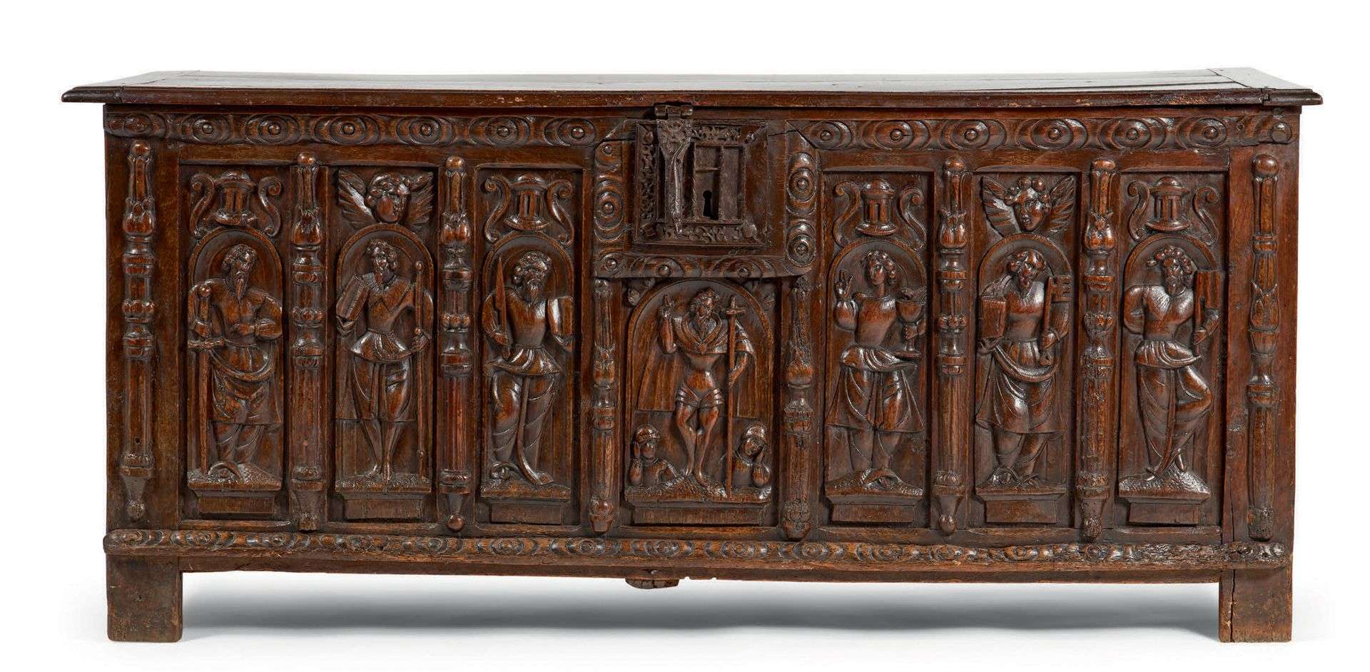 COFFRE AUX SAINTS PERSONNAGES en chêne sculpté. Il présente sept panneaux en façade, embrevés dans le bâti, sculptés en profond relief de personnages masculins représentant des saints placés sous des niches. Trois par trois, ils encadrent une scène de résurrection, placée au centre. Le Christ, debout vêtu du perizonium et les épaules couvertes d'un manteau, lève la main droite en signe de bénédiction. De la gauche il s'appuie sur un baton formant une croix. À ses pieds, les deux gardes sont assoupis. Entre chaque panneau sont sculptées en appliques des colonnettes tournées en balustre. Sur les panneaux rectangulaires sont représentés six apôtres : Saint Paul, Saint Jacques le Majeur et Saint Barthélemy. Saint Jean, Saint Pierre et Saint Matthieu. Sur les côtés sont représentés deux profils se faisant face, un homme casqué et une femme. Serrure à moraillon d'origine, finement ciselée d'une salamandre. La base moulurée et sculptée de formes concentriques.