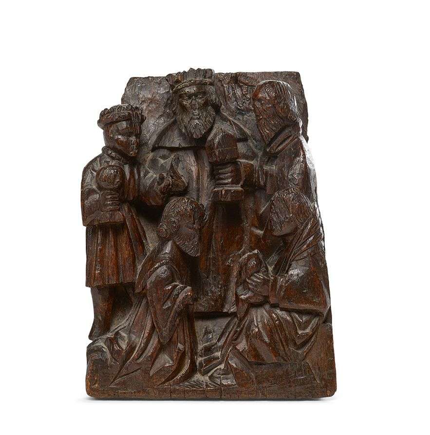 ÉLÉMENT DE RETABLE en bois de chêne sculpté représentant l'Adoration des Mages.Travail d'Europe du Nord, XVe siècle.
