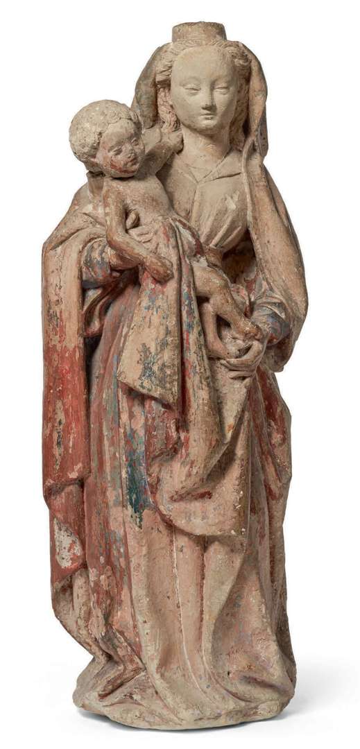 VIERGE À L'ENFANT en pierre sculptée, debout, tenant l'Enfant Jésus sur son bras droit. Elle est coiffée d'un voile et vêtue d'un long manteau.France, probablement Champagne, début du XVIe siècle, vers 1530.