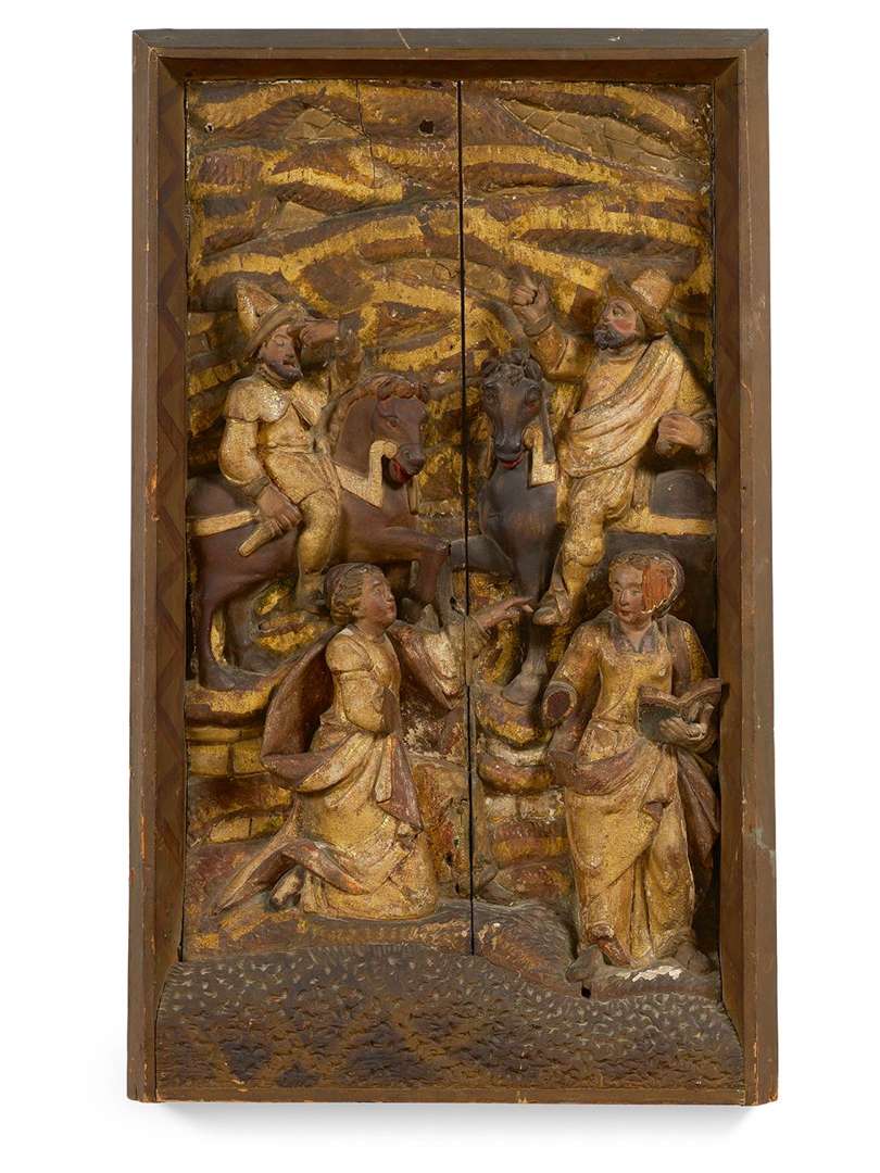 PANNEAU DE RETABLE en bois de chêne sculpté et peint polychrome représentant au premier plan deux femmes, l'une faisant une génuflexion devant l'autre, debout, en lecture. À l'arrière plan deux cavaliers : l'un désignant le ciel, l'autre désignant son propre front. Peut-être une Annonciation au premier plan et deux Rois Mages à l'arrière plan ? Europe du Nord, fin du XVIe siècle.
