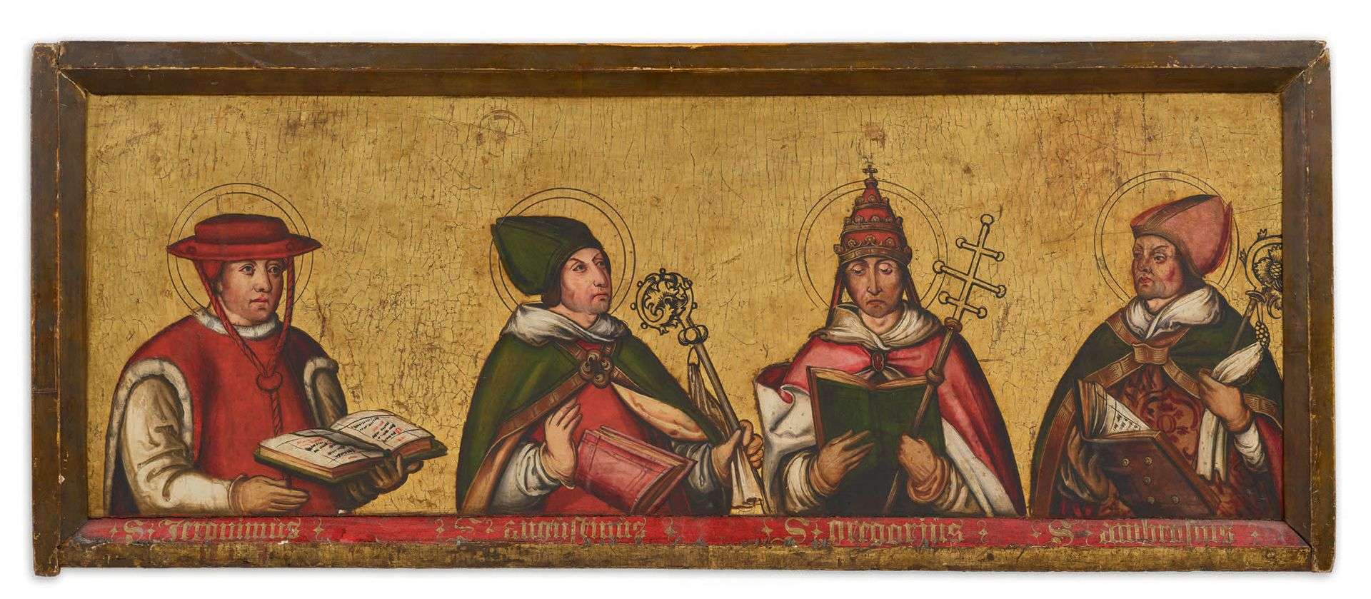 LES QUATRE DOCTEURS DE L'ÉGLISE LATINE SUR FOND D'OR Huile sur panneau de bois. Les quatre personnages sont nommés en écriture gothique : Saint Jérôme, Saint Augustin, Saint Grégoire et Saint Ambroise.École Allemande du début du XVIe siècle.