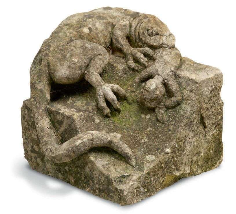 Sculptée représentant une bête monstrueuse (salamandre ?) dévorant un homme. Peut-être une base de colonne. Probablement France, XIVe siècle.