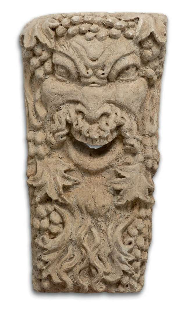 DEUX GRANDS MASQUES de faunes grimaçants entourés de pampres en pierre cal
