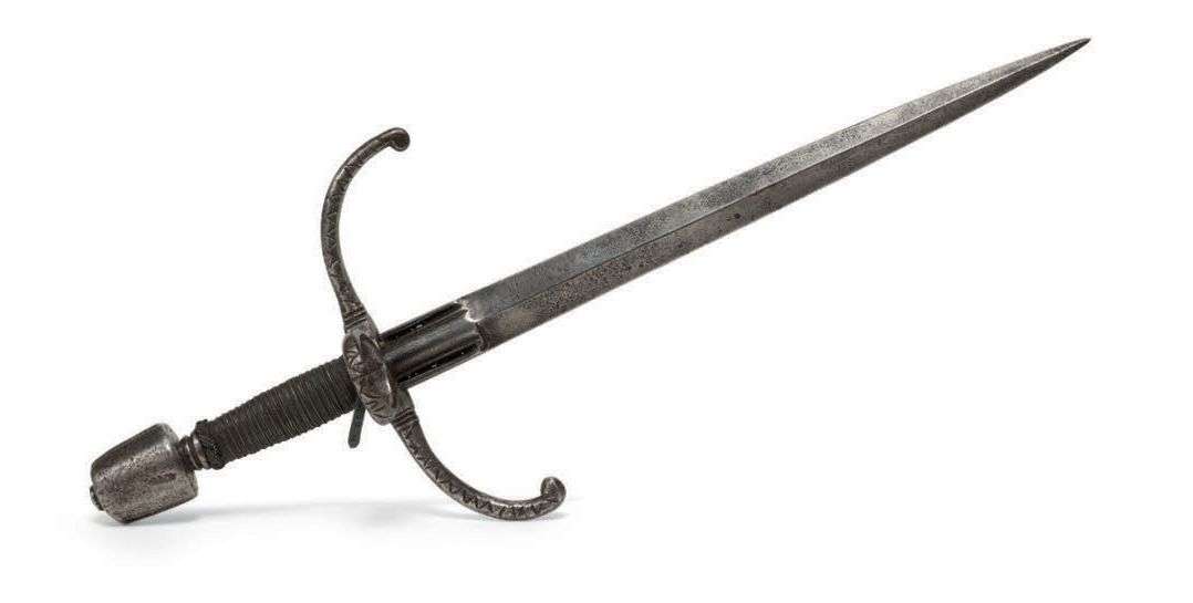 DAGUE À ANNEAU DITE «MAIN GAUCHE» en fer, le pommeau en trapèze. La fusée à filigrane, garde à anneau et deux quillons plats infléchis gravés. La lame à ricasso nervuré, section en losange. Fin du XVIe siècle, début du XVIIe siècle.