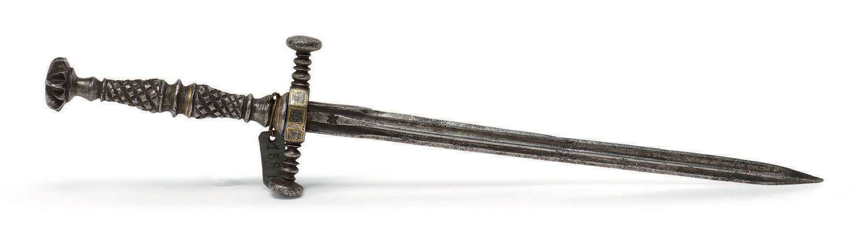 DAGUE STYLET en fer et filets d'argent et d'or incrustés. Le pommeau en bouton écrasé travaillé en étoile. La fusée de deux balustres adossés en pomme de pin, deux quillons droits en tournage terminés par des boutons lisses écrasés. Lame stylet à section losange à gorge. Deux poinçons étoile sur la lame. Fin du XVIe siècle, début du XVIIe siècle.