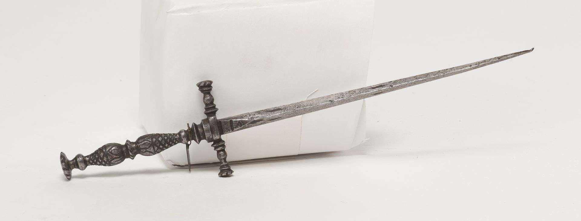 DAGUE STYLET en fer. Le pommeau en bouton écrasé à retors. La fusée de deux balustres adossés en pomme de pin, deux quillons droits en tournage terminés par des boutons écrasés à retors. Lame stylet à section triangulaire. Trace de poinçon. Fin du XVIe siècle, début du XVIIe siècle.
