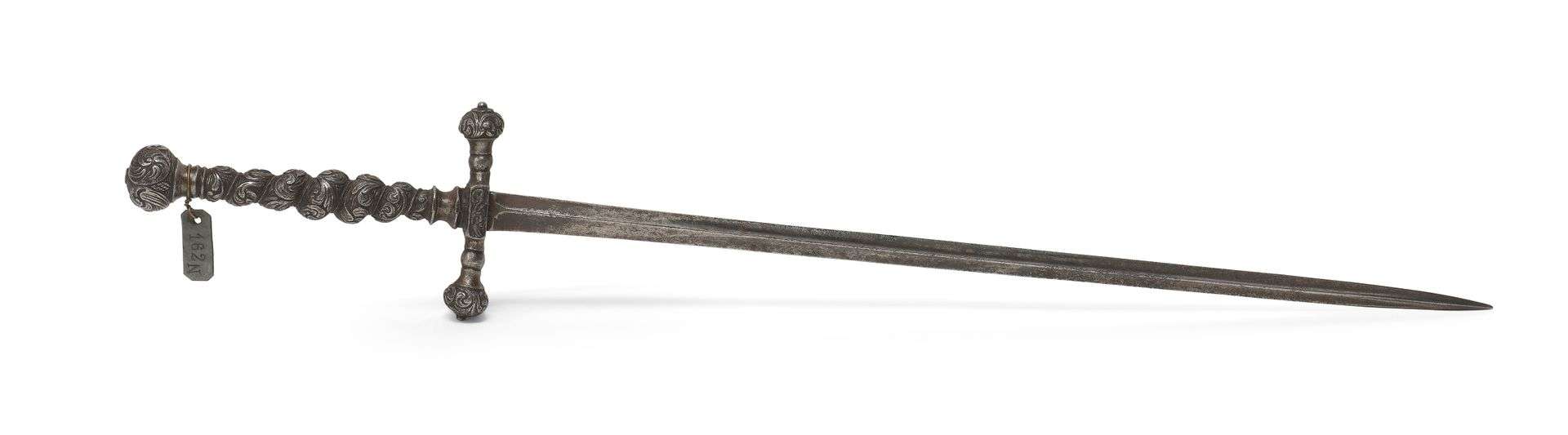 DAGUE STYLET en fer. Pommeau, fusée et garde d'une seule pièce richement ciselée de feuillages tors, la fusée en bourrelets tors. Quillons droits terminés par des boutons feuillagés. Lame stylet à section triangulaire. Fin du XVIe siècle, début du XVIIe siècle.