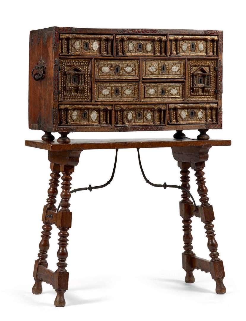 BARGUEÑO RECTANGULAIRE la facade en bois sculpté et doré. Il ouvre à dix tiroirs et deux tabernacles décorés de plaquettes d'os gravées entre des colonnettes à losanges. Poignées latérales en fer forgé. Repose sur quatre pieds boules. Espagne, XVIIe siècle.
