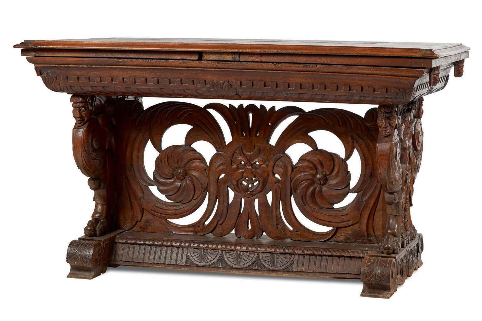 TABLE «À LA LYONNAISE» en noyer au naturel. Elle repose sur deux montants patins richements sculptés de grotesques à pattes de lions encadrant respectivement des allégories de la Jeunesse et de la Vieillesse en terme. La partie centrale d'un grand masque radié grotesque encadré par deux fleurons reposant sur une base d'entretoise. Le plateau au naturel s'augmente de deux rallonges discrètes dissimulées en dessous. Style Renaissance, dans l'esprit de Fourdinois, XIXe siècle.