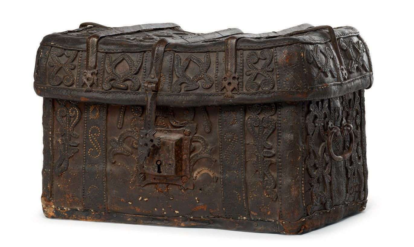 COFFRET DE VOYAGE en cuir brun, épais, orné de nombreuses fleurs de lys et autres contournements stylisés d'épais cuir cousu avec des nerfs. Le couvercle renforcé de pentures en fer forgé, gravées et terminées par des aigles bicéphales. Serrure de fer forgé à moraillon. Espagne, XVIIe siècle. L'intérieur est garni de velours à damas cramoisi.